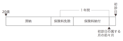 初診日の前日において、65歳未満で、当該初診日の前々月までの1年間に、保険料納付済期間と保険料免除期間以外の被保険者期間がないこと(未納・滞納期間がないこと) |